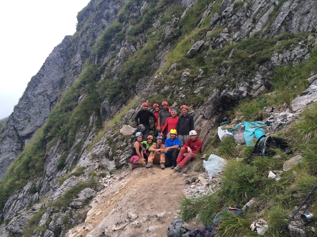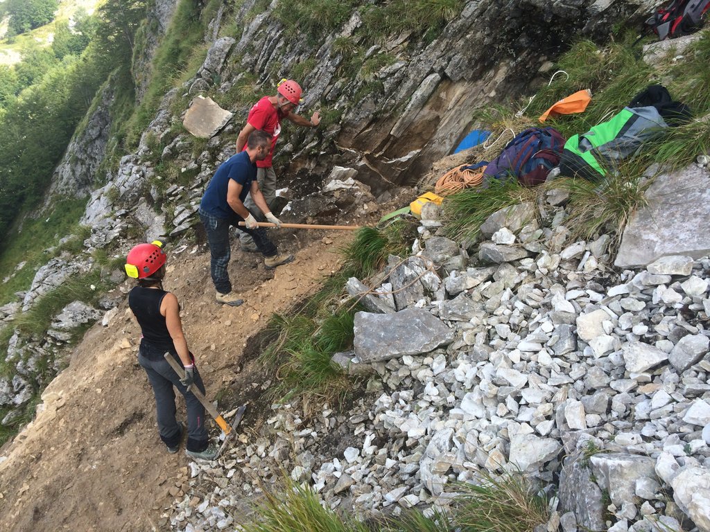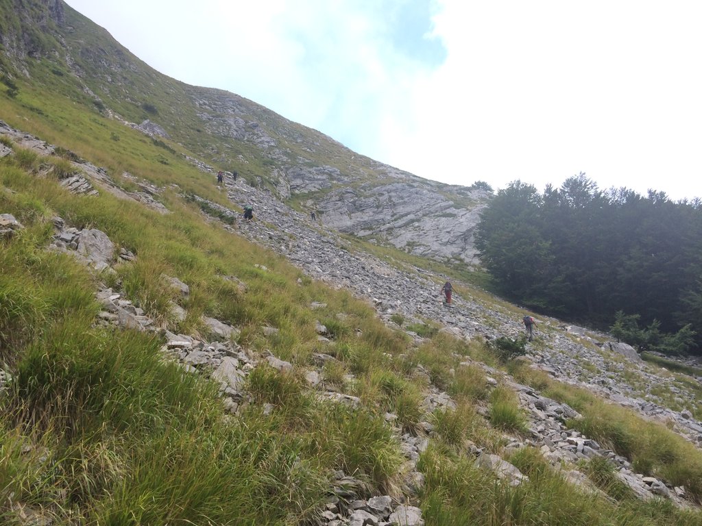 Il sole alto, luce intensa, cielo azzurro e ravaneto, meglio attrezzati, più braccia. Lungo serpeggiare nella fresca brezza che scende dal canale, ora la catena umana riprende da dove, in pochi, abbiamo lasciato il giorno prima.