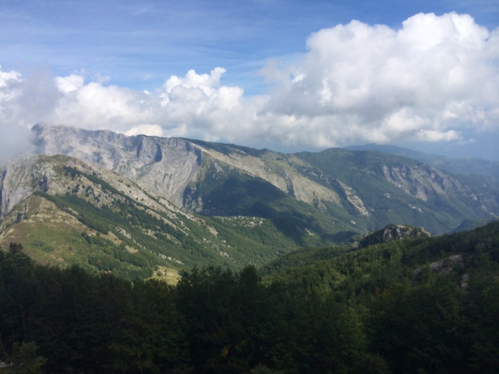 Nuvole che corrono veloci in un oceano azzurro, il bosco di faggi, poco sotto dove finisce il ravaneto, il Sumbra, il Grondilice più lontano appena visibile il Sagro, l' appennino tosco emiliano avvolto nella foschia e sotto il Freddone.